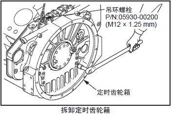 (2) 將三菱S12柴油發(fā)動(dòng)機(jī)正時(shí)齒輪箱吊住并向外移動(dòng)至脫出定位銷后拆下。