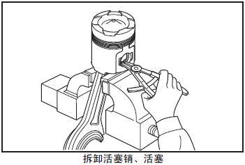 (2) 用木條頂住三菱S12柴油發動機活塞銷的端面,用錘輕擊,拔除三菱S12柴油發動機活塞銷,使三菱S12柴油發動機活塞和三菱S12柴油發動機連桿分離。