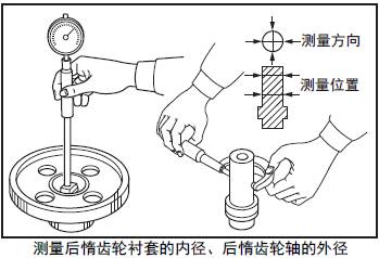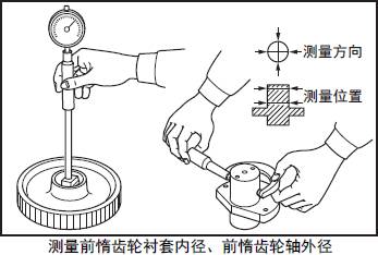 測量前三菱R16柴油發動機惰齒輪襯套的內徑和前三菱R16柴油發動機惰齒輪軸的外徑。超過極限值時,更換新的前三菱R16柴油發動機惰齒輪總成或前三菱R16柴油發動機惰齒輪軸。