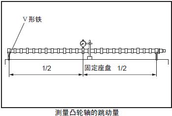 注: 使用千分表,回轉三菱R16柴油發動機凸輪軸一周測量指針的跳動量。