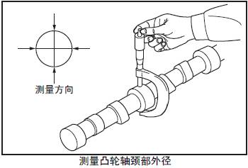 測量三菱R16柴油發動機凸輪軸頸部正交兩個方向的外徑。超過極限值時更換新的三菱R16柴油發動機凸輪軸。