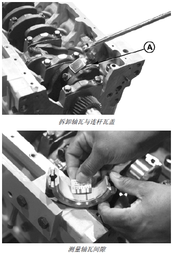10. 拆卸活塞和連桿總成之前,用 PLASTIGAGE® 測(cè)量連桿軸瓦與軸頸之間的油隙。記錄測(cè)量值。(請(qǐng)參閱本章后面的“檢查和測(cè)量連桿軸瓦”部分。)