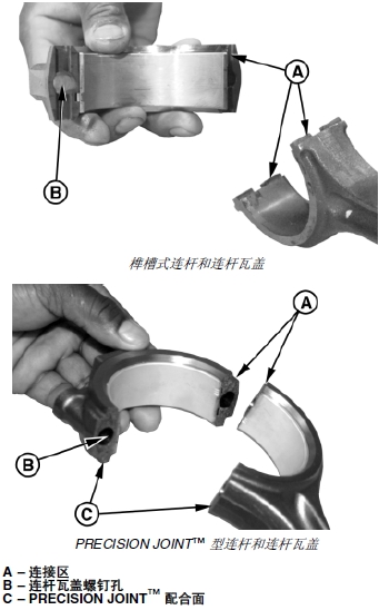 重要提示: 不得劃傷連桿和連桿瓦蓋的連接面。對(duì)于確保 PRECISION JOINT™ 連桿正確安裝來(lái)說(shuō),這是非常重要的。禁止用鋼絲刷或其他工具刷連接面 (C)。必須保護(hù)互鎖配合面。