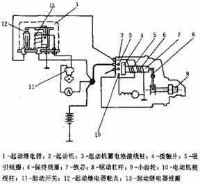 起動機電磁操縱機構主要由吸引線圈、保持線圈、驅動杠桿、起動開關接觸片等組成。